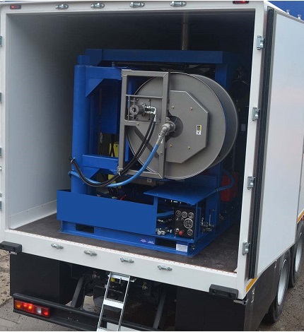 собран на базе двигателя John Deere (США), насосная часть устанавливается Pratissoli или HPP (Италия). В базе используется гидравлический привод вращения барабана разматывающего и собирающего шланг, с плавной регулировкой скорости подачи.